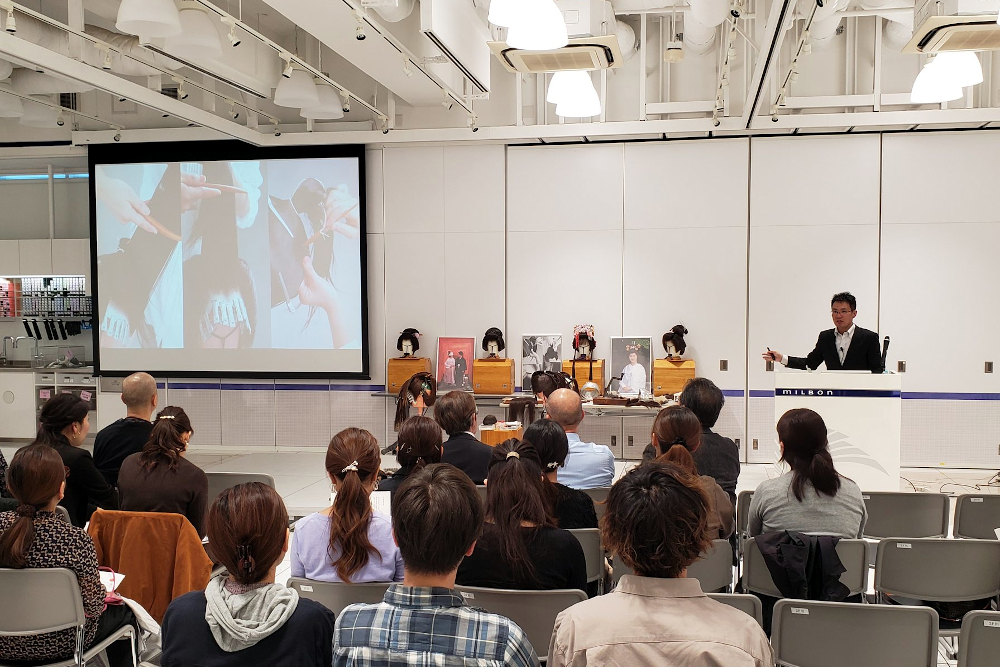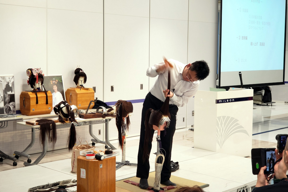 NHDK美協 日本ヘアデザイン協会(横田敏一理事長)学芸文教委員会(委員長五十嵐義昭)主催による特別セミナー『日本髪のかつら製作:その奥義』が11月12日、株式会社ミルボン東京スタジオで開催された。講師は、有限会社かつらしげもりの二代目重盛真広氏。