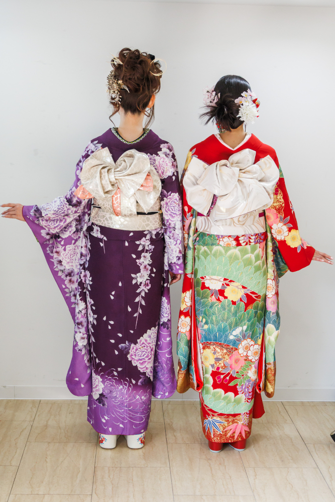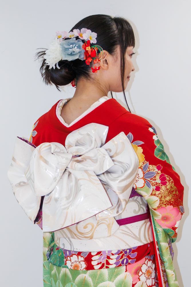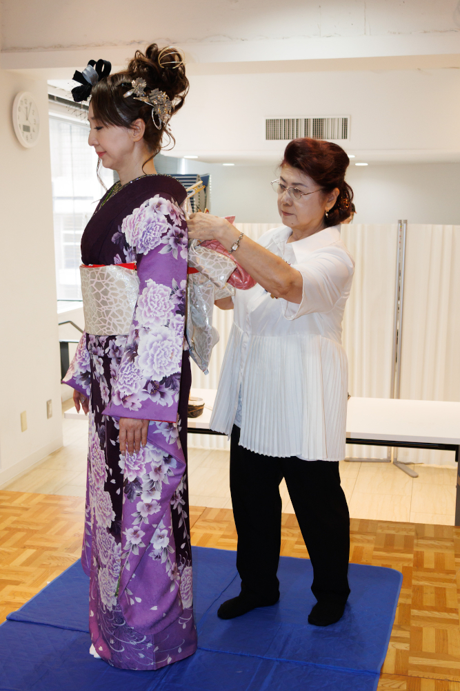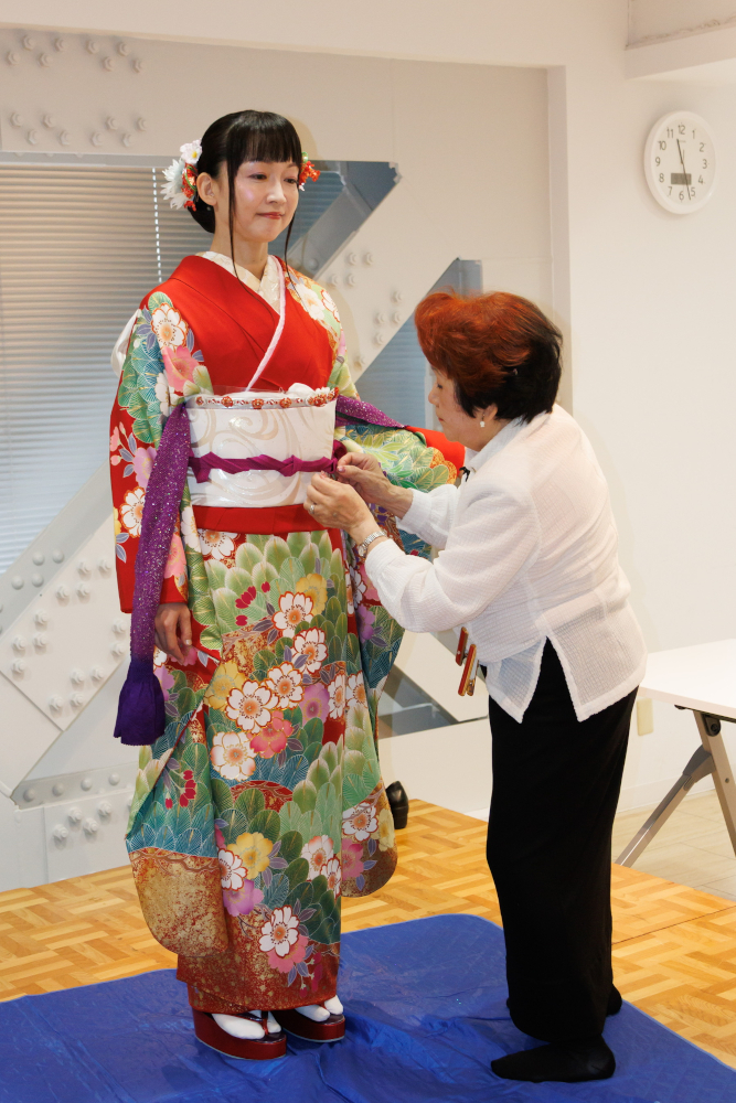 初めに飯塚講師が帯結び『櫻花』(さくらばな)を披露。世界中の人々がうらやむ日本の春といえば櫻。東京の櫻に思いを馳せて、その思いを帯結びで表現している。続く吉澤講師は『フュージョン』(融合)を披露。過去の文化を守りつつ、進化しながら発展をしていく魅力あふれる東京のイメージを帯結びに表現している。それぞれ帯結びが仕上がった状態でモデルが登場し、披露した後に一度帯をほどき、再び帯を結びなおしながら結び方を説明。その後、別の帯を使用して手先、垂れ先の作り方を丁寧に解説した。
