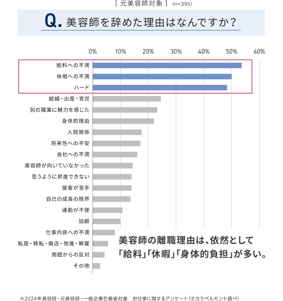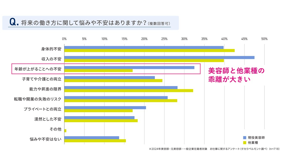 厚生労働省の「衛生行政報告例」(令和3年度)によると、美容師の入社3年以内の離職率は50%以上、10年以内では約90%に達している。離職理由は「給与の低さ」「休暇の取りづらさ」「仕事のハードさ」に加え、「結婚・出産・育児」などライフイベントも大きな要因となっており、ワークライフバランスの両立が難しいことが浮き彫りとなっている(表1)。また、他業種に比べ、理美容師の多くが「年齢が上がることへの不安」を感じており(表2)、理由としては「健康」「お金」「キャリア」、そして「ライフイベント」があげられる。