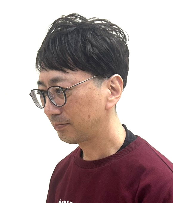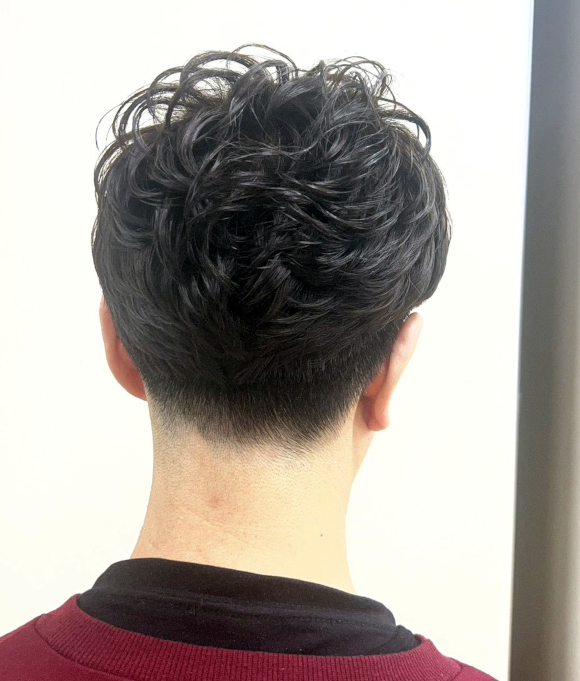 第二部のサロンヘアスタイルでは、東京本部・井上宏之氏がモデルを務めた。カットはツーブロックベースとし、下部は6mm・3mmで整え、後頭部は約2cmの刈り上げで構成。上部はマッシュベースにチョップカットを施し、あえて梳き鋏を使わないことでパーマとの親和性を高めた設計がなされた。