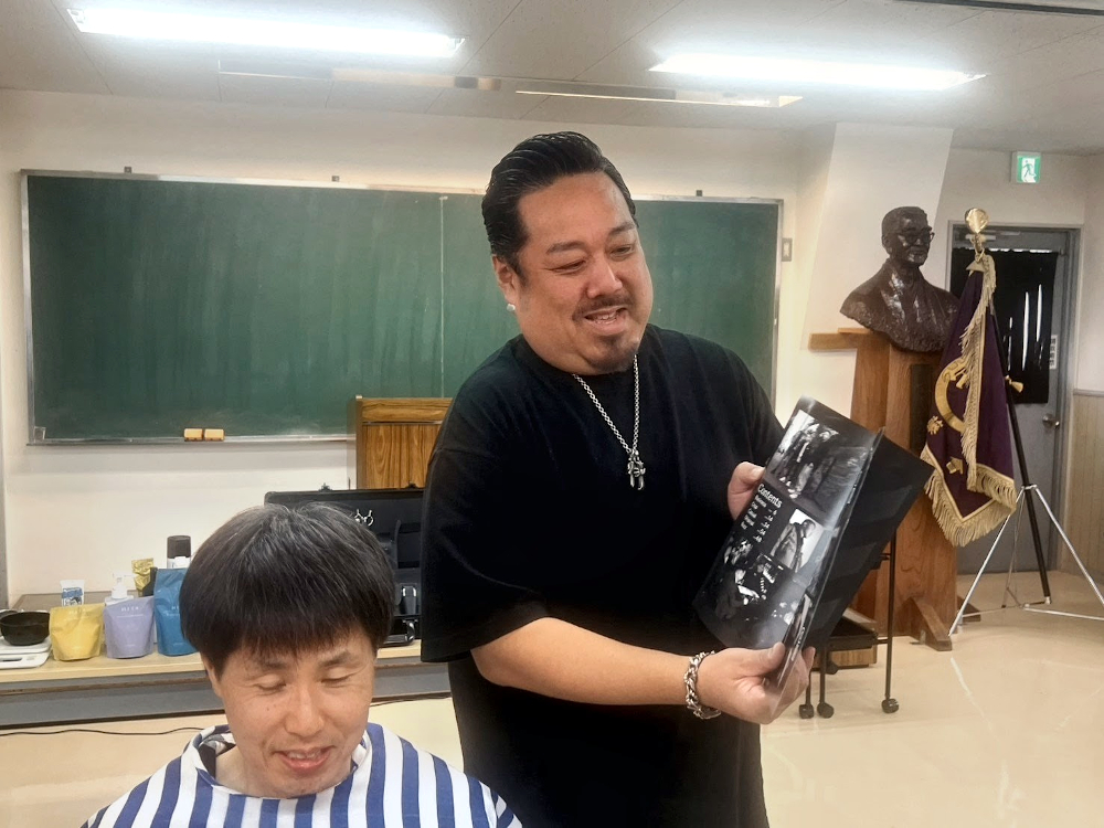 第一部の濡れパンスタイルでは、岡山本部・石田顕一本部長がモデルを務め、浅草のお祭り宮元会長のスタイルをイメージしたデザインを披露。薬剤にはルベルのヒタを使用し、柔らかさと手触りの良さを重視した質感づくりがテーマとして提示された。